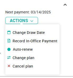 Monthly membership fees must always have a card on file - we wouldn't dream of putting that administrative burden on you and your team! In the case that a monthly member wishes to make an in office payment in the middle of their term, you may click on the "Actions Button" and then Record In-Office Payment.