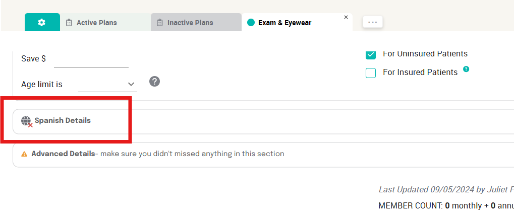 In your plan editor window, click the Spanish Details option and provide the plan name and description in Spanish.