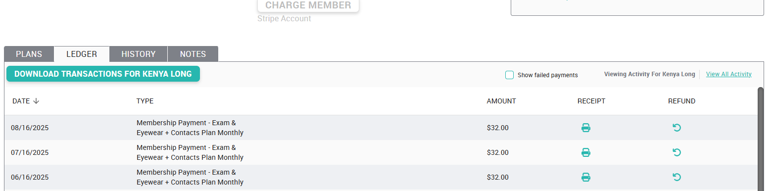 On the patient's ledger tab, you'll see each transaction listed. Click the "Refund" button on the specific transaction that needs to be refunded. Enter the amount of the refund, the reason, confirm and call it a day. The system will allow a refund of any amount up to the total amount paid by the member, and the refund will ALWAYS be issued back to the original payment method.